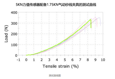 本測試TIKTOK色情版下载使用了KZ-5KN單柱TIKTOK黄APP下载 ,配備5KN靜態力傳感器, 1.75KN氣動細繩和紗線夾具。試樣的標距長度 設為250mm,橫梁的移動速度為250mm/min,使用全閉環伺服采集軟件,采樣間隔 50ms。為了檢查打滑,TIKTOK色情版下载在絲的每一端粘貼了一個標記,並檢測帶條以檢測標記和夾具之間沒有相對移動。第二個試驗中,用2KN的氣動芳族聚酰胺紗線和紗線夾具換下1.75KN的紗線夾具。