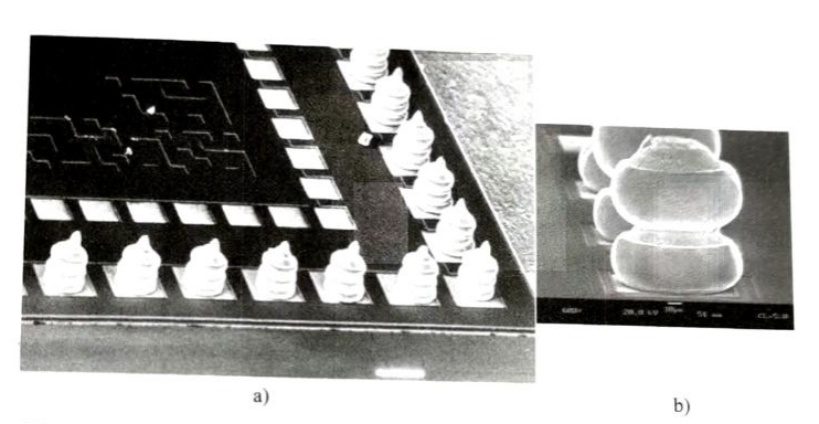 a)一個全焊盤都鍵合三層“球凸點”的芯片b)一個雙層“精準定位的凸點/頂部削平的凸點”示例