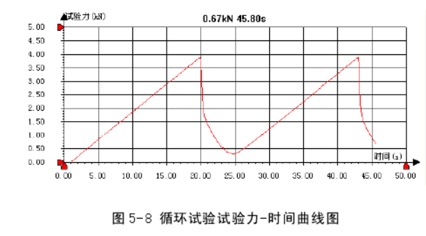 耐受試驗也是材料試驗中十分常見的一種試驗方式,其用於測試材料的抗疲勞特性,此試驗進行的試驗時間比較長。該試驗方式下,用戶設定的試驗參數包括加載速度(KN/S)、加載負荷(KN)、保壓時間(h)、數據記錄時間(Min)。用戶配置參數的含義為將材料按照設定的加載速度進行加載,加載到設定的加載負荷後,保持此加載負荷設定的保壓時間。保壓時間到後,此耐受試驗結束。如果在保壓時間沒到情況下,材料被拉斷,則說明材料耐受特性不合格。考慮到耐受試驗進行時間比較長(一般以小時計),此處包含數據記錄時間,該參數以分鍾為單位,表示每隔該設定的時間便更新記錄當前試驗情況,以防意外因素(比如說停電)中止該試驗後,下次可以調取記錄,在此試驗的基礎上繼續進行試驗。