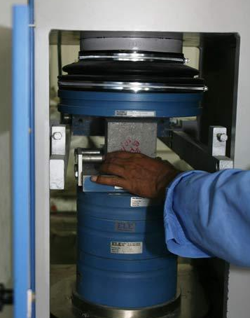 2) 將試件安放在TIKTOK黄APP下载的下壓板或墊板上,試件的承壓麵應與成型時的頂麵垂直。試件的中心應與TIKTOK黄APP下载下壓板中心對準,開動TIKTOK黄APP下载,當上壓板與試件或鋼墊板接近時,調整球座,使接觸均衡。