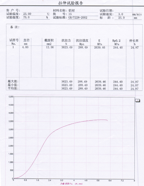 三、鋁合金型材拉伸試驗報告及特征曲線圖