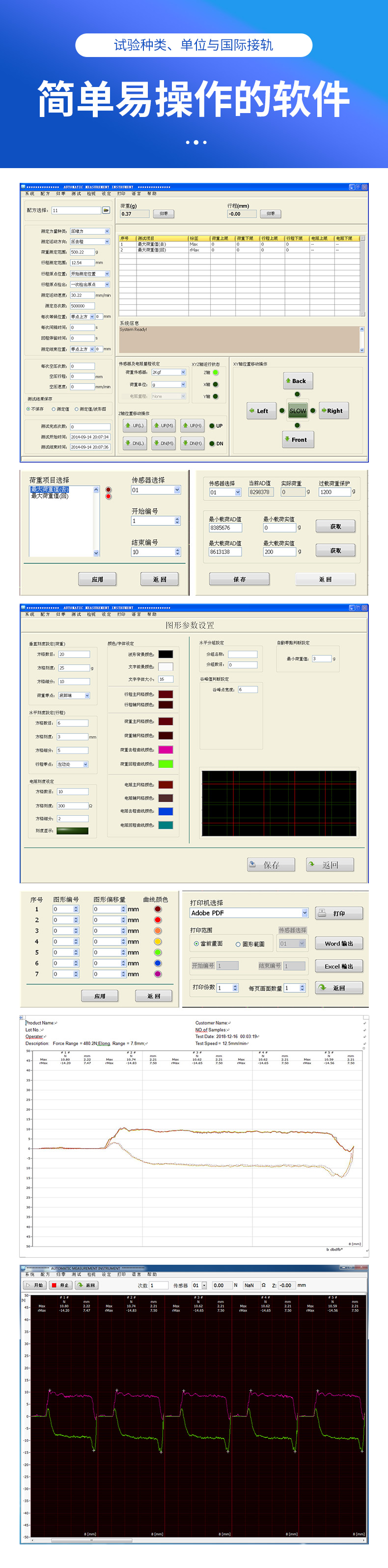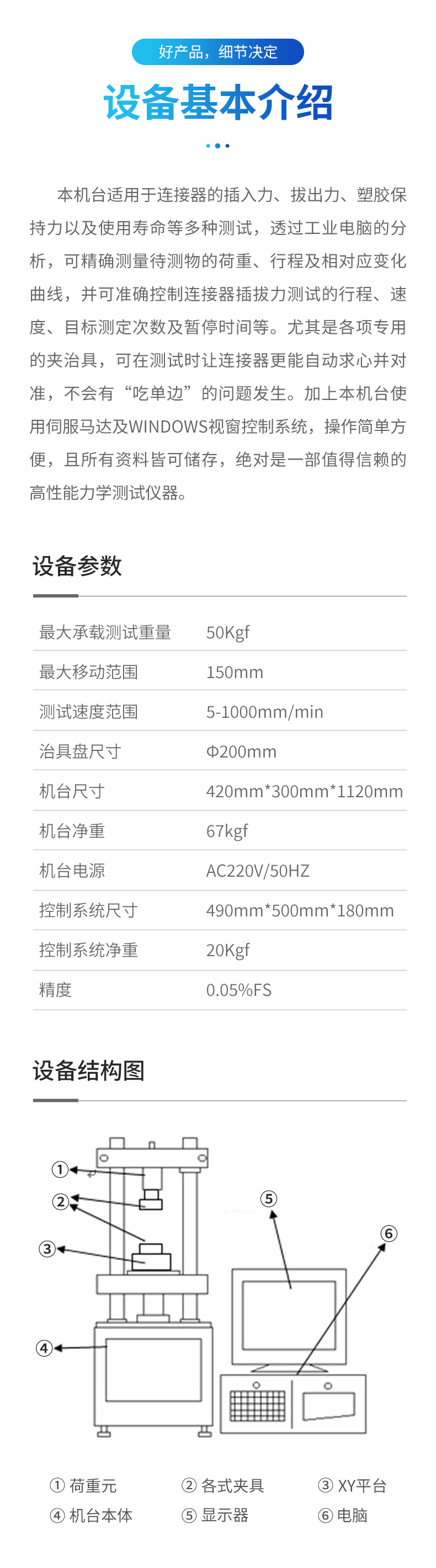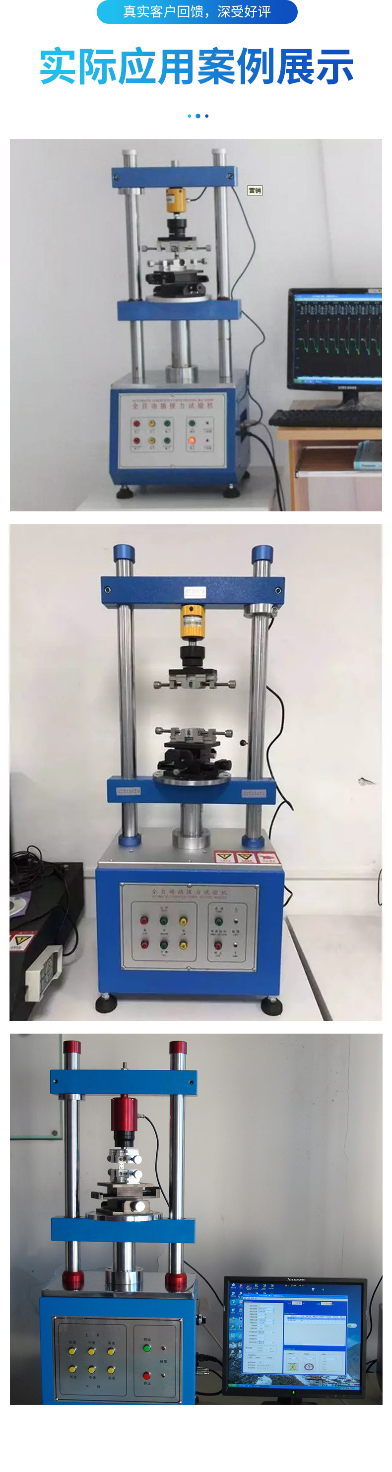 通過工業電腦的分析,可精確測量待測物的荷重、行程及相對應變化曲線,並可準確控製連接器插拔力測試的行程、速度、目標測定次數及暫停時間等。尤其是各項專用的夾治具,可在測試時讓連接器能自動求心並對準,不會有“吃單邊”的問題發生,加上本機台使用伺服馬達及Windows視窗控製係統,操作簡單方便,且所有資料皆可儲存,絕對是一部值得信賴的高性能力學測試儀器。