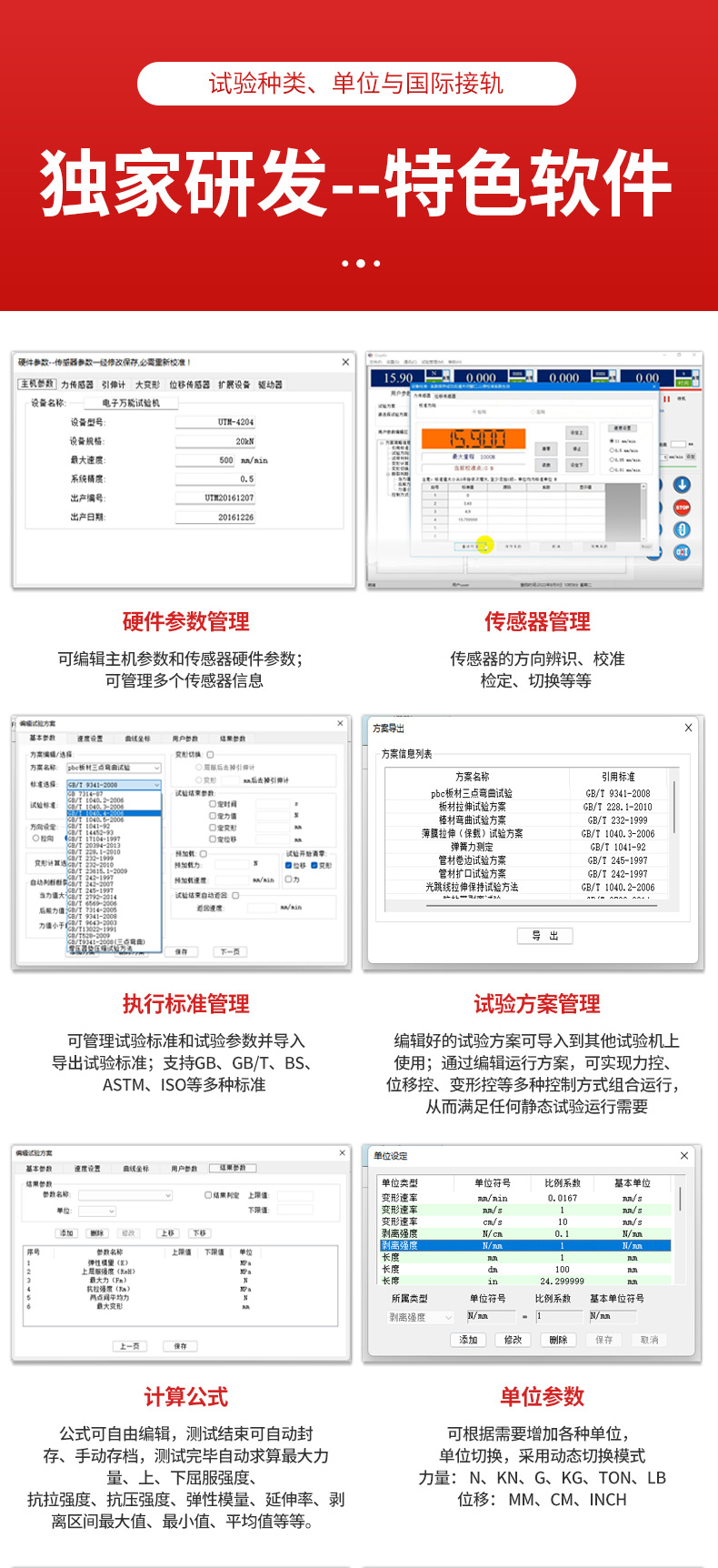 4.Windows XP操作係統下的全開放式測試軟件,用戶可使用軟件現有功能完成幾乎所有的力學測試項目,也可根據自己的實際需要自行編輯測試方法。